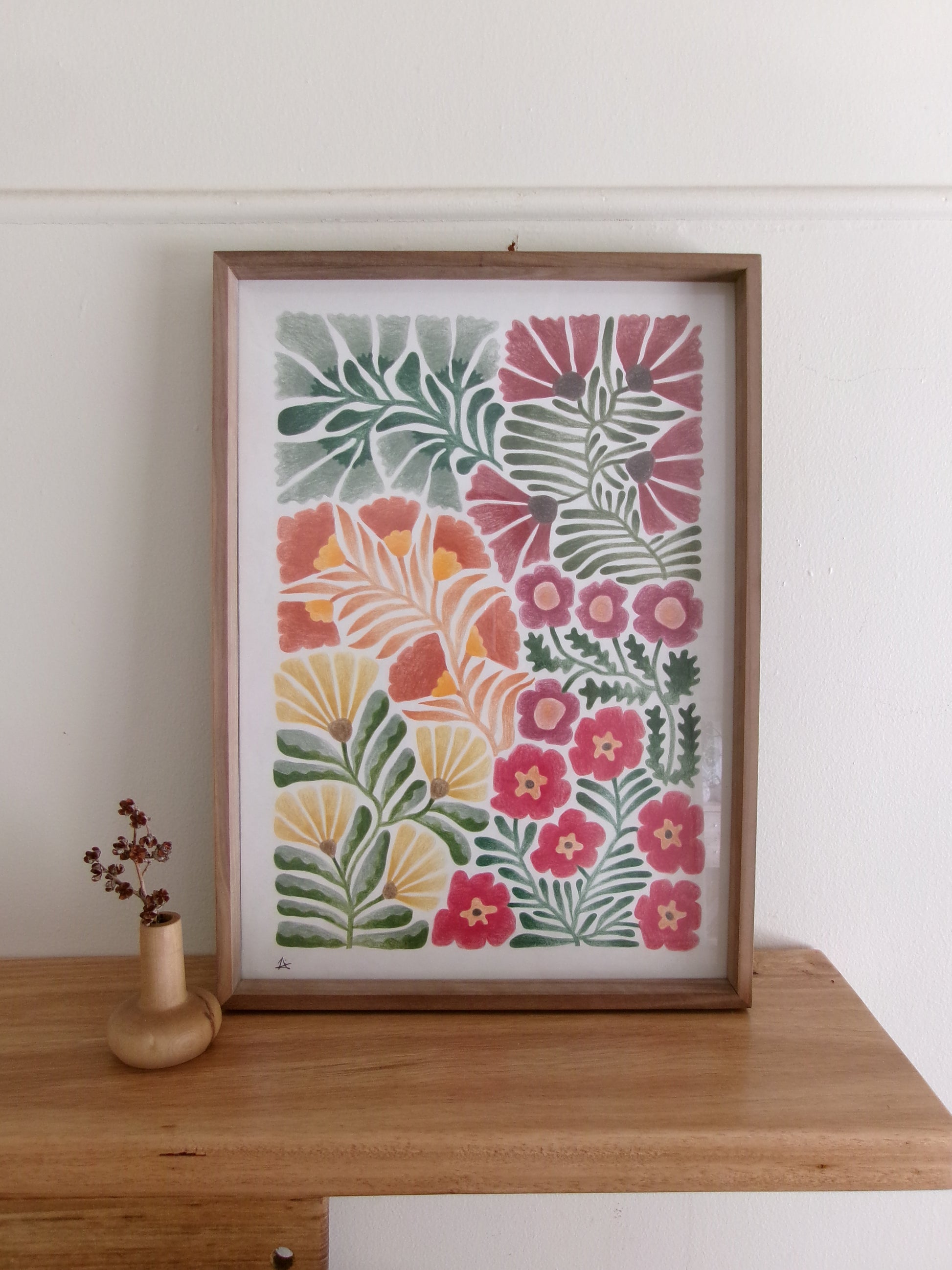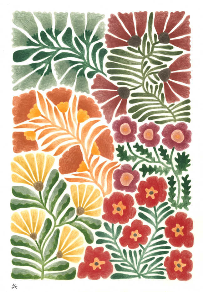 This drawing came from a deep love for creating unique floral patterns and forms. This drawing, like many of my others, also explores how a space can be filled. The space is full, but it is full of life and colour. Each form and flower is uniquely its own. The negative space surrounding the drawing borders and completes it well.